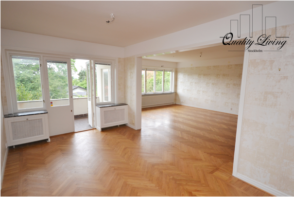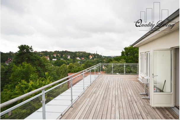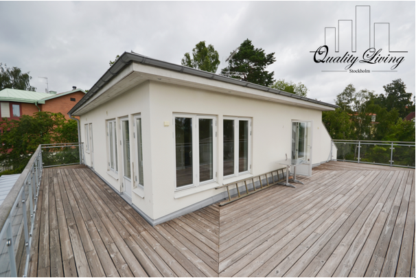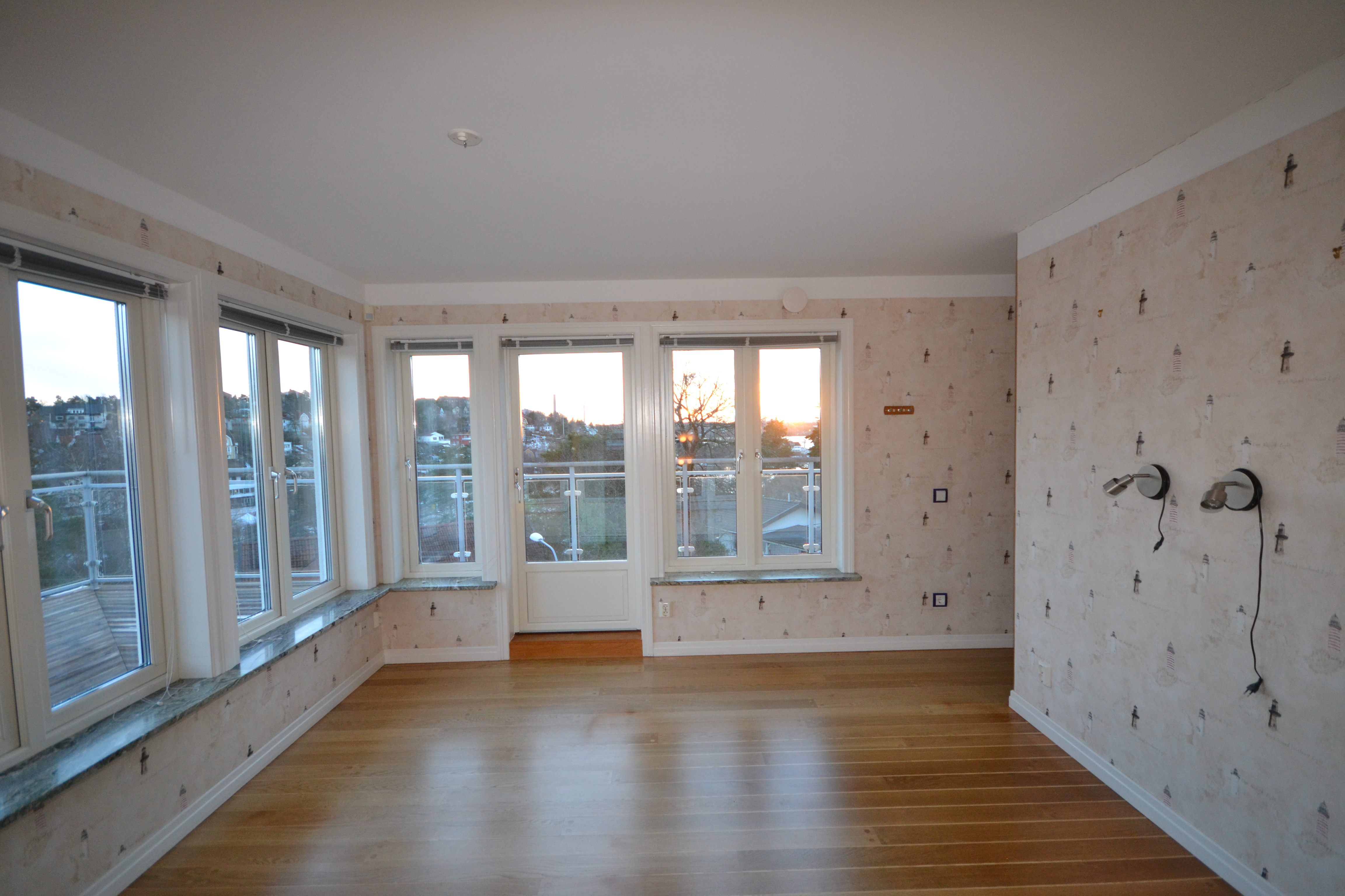 Planlösning: Genomgående ljusa interiörer samt fiskbensparkett. Stora fönsterpartier med mycket ljusinsläpp. 2 stycken balkonger samt en stor takterrass med fantastisk utsikt. Öppen spis i vardagsrum