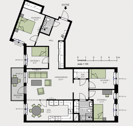 Planlösning: Lägenhet högt upp i huset om 115 kvm med 5 RoK varav fyra sovrum, kök, vardagsrum, två badrum med dusch i båda och tvättmöjligheter. Lägenheten har en balkong samt garageplats med troligtvis elbilsladdare.