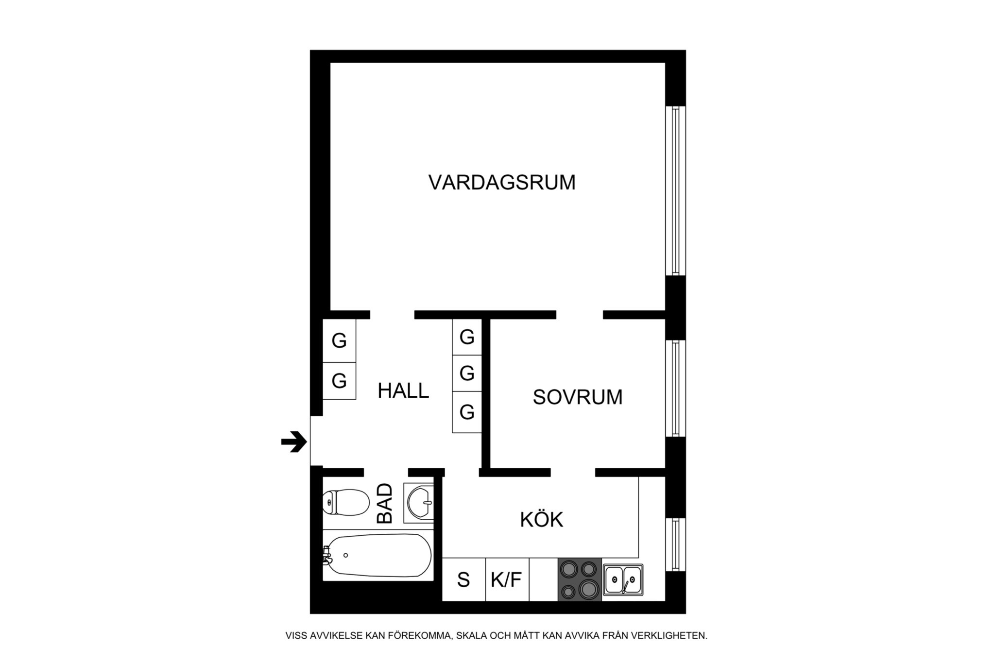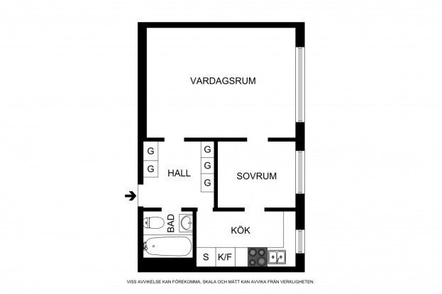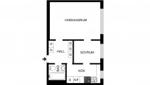 Planlösning: 2:a om 41 kvm med separat kök, vardagsrum, ett sovrum, hall och badrum med badkar.
