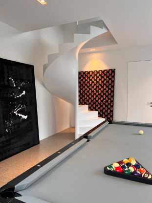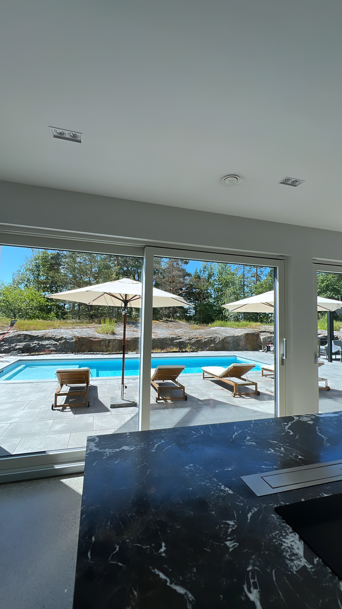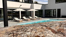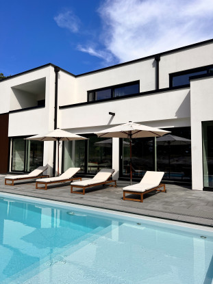 Planlösning: Nybyggd (2022) villa om 359 kvm fördelat på två våningar med sociala ytor, kök, fyra sovrum, tre badrum, bastu, tvättmaskin, torktumlare och trädgård med altan och pool.