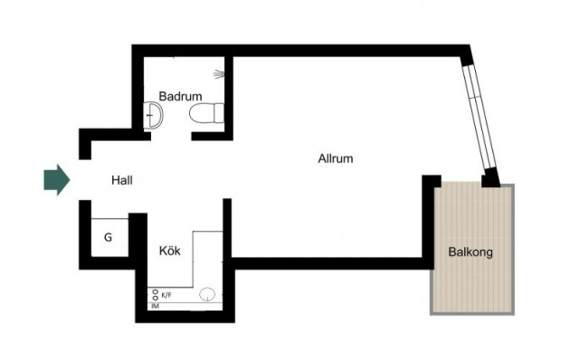 Fin 1:a på Gärdet om 23 kvm med balkong. Uthyres möblerad eller omöblerad endast till företag.