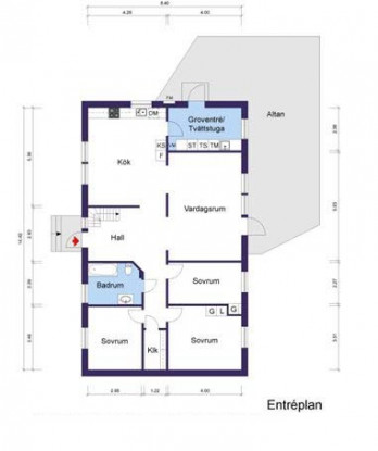 Tvätt: Tvättstuga i groventré med tvättmaskin och torkskåp