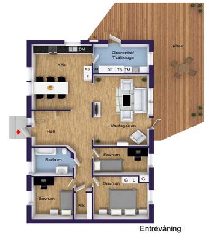 Villa om 121 kvm där nedre plan har 3 sovrum, vardagsrum, kök, badrum samt tvättstuga och klädkammare. Övervåningen med hobbyrum.