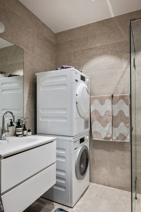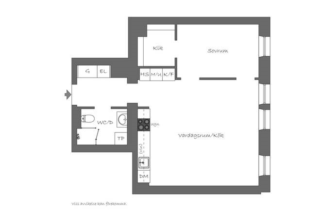 Planlösning: Lägenhet om 53 kvm med öppen planlösning mellan kök och vardagsrum, ett sovrum, badrum med dusch, tvättmaskin samt torktumlare.