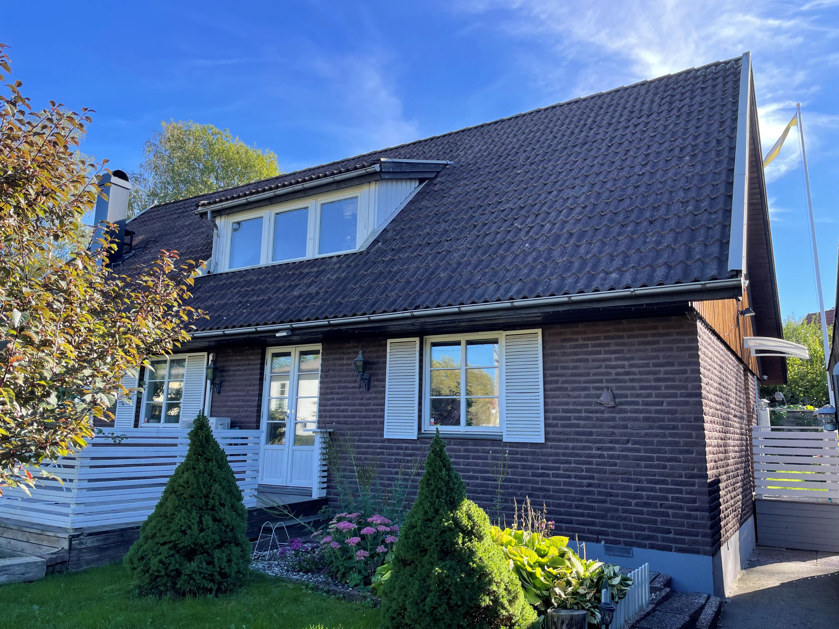 Planlösning: Villa fördelat på två våningar om 172 kvm med hall, sällskapsrum, matplats, kök, fyra sovrum, två badrum med dusch, tvättmaskin och torktumlare. Trädgård med garage och altan.
