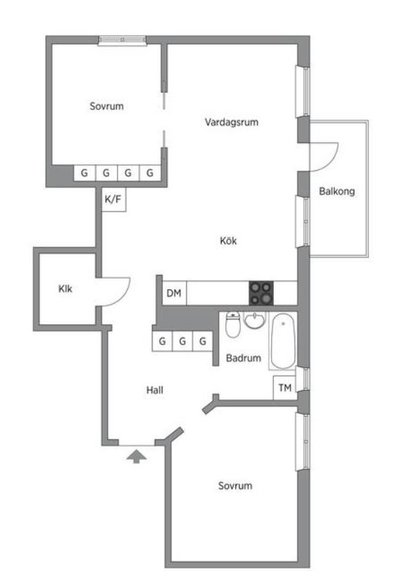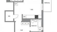 Planlösning: Lägenhet om 67 kvm med ett större och ett mindre sovrum. Kök med matplats och vardagsrum i öppen planlösning. Stor balkong i sydväst läge med utgång från kök/ vardagsrum. Badrum med badkar, dusch och tvättmaskin.