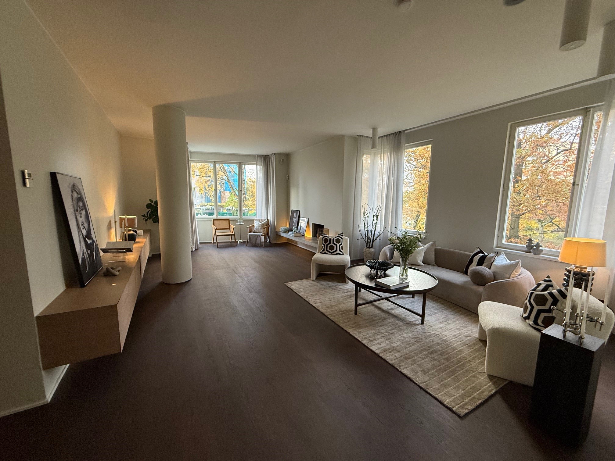 Planlösning: Totalrenoverad lägenhet om 151 kvm med fyra sovrum, stora sociala ytor, kök, matplats, golvvärme i alla golv, två badrum och en gäst-WC. Egen terrass samt balkong.