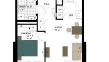 2:a om 41 kvm högst upp i huset med balkong, ett sovrum, kök, vardagsrum, badrum med dusch och kombimaskin. Se även bild.