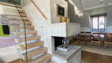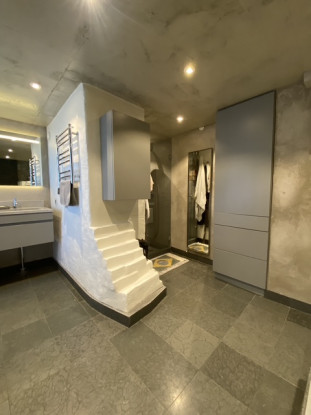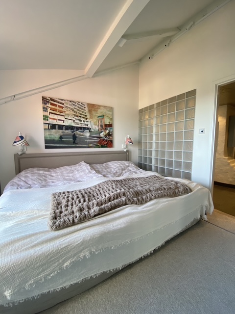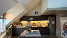Planlösning: Vindsvåning om 130 kvm med öppen planlösning mellan vardagsrum, matplats och kök. Stort sovrum med anslutande badrum, två mindre sovrum på nedre våningsplan samt ett till sovrum uppe på loftet. Gästtoalett finns med dusch samt tvättmaskin och torktumlare. Lägenheten har två altan med utgång från vardagsrummet och den andra från stora sovrummet.