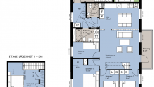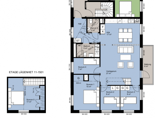 Planlösning: Modern etagelägenhet om 118 kvm med stort vardagsrum, kök, fyra sovrum samt ett extra allrum/sovrum på övervåningen. Bostaden har två badrum med dusch samt kombimaskin.